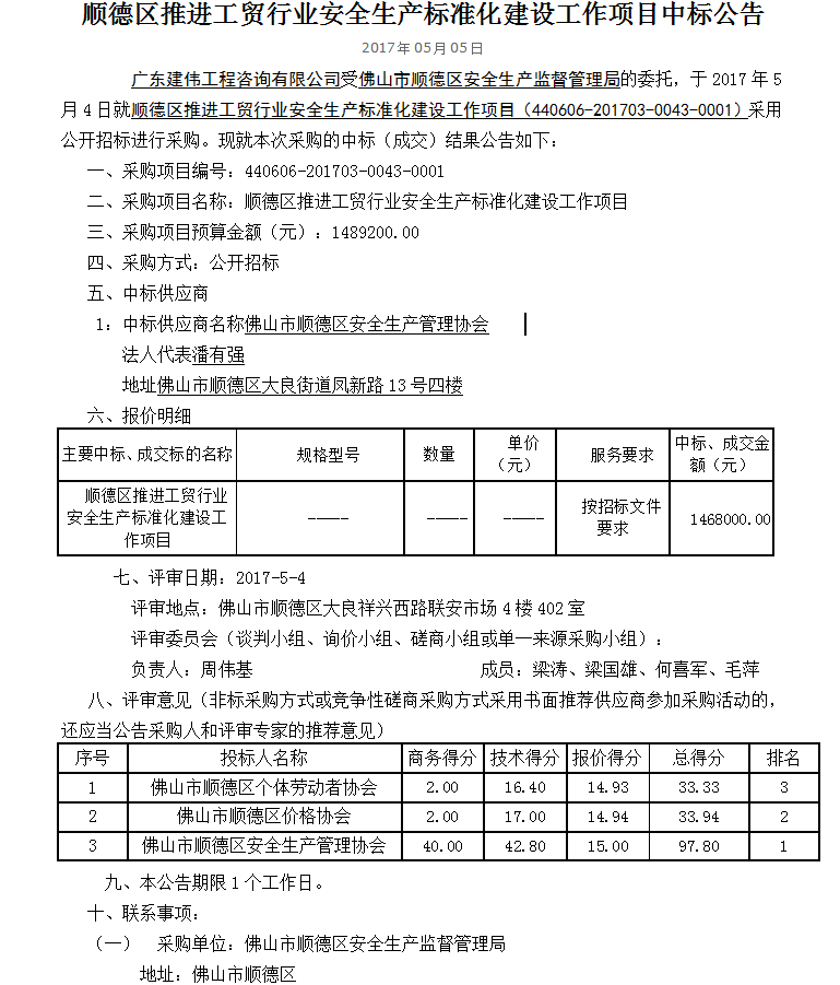 顺德区推进工贸行业安全生产标准化建设工作项目中标公告