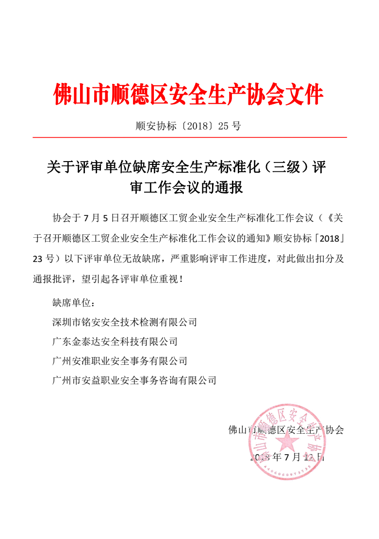 关于评审单位缺席安全生产标准化(三级)评审工作会议的通报
