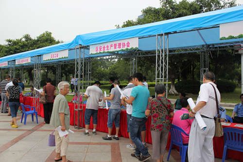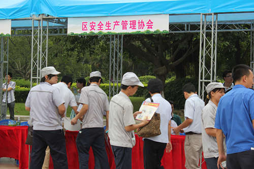 在现场,各职能单位分别根据自己的职能,进行有特色的宣传,如区市场安全监管局以有安全生产标识的纸巾和毛巾作为现场送给大家的礼品,区国土城建和水利局则运用送包含工地安全、人防工程等宣传知识的扇子给市民,区总工会则为其有奖灯谜竞猜活动准备了牙膏牙刷等众多生活用品。