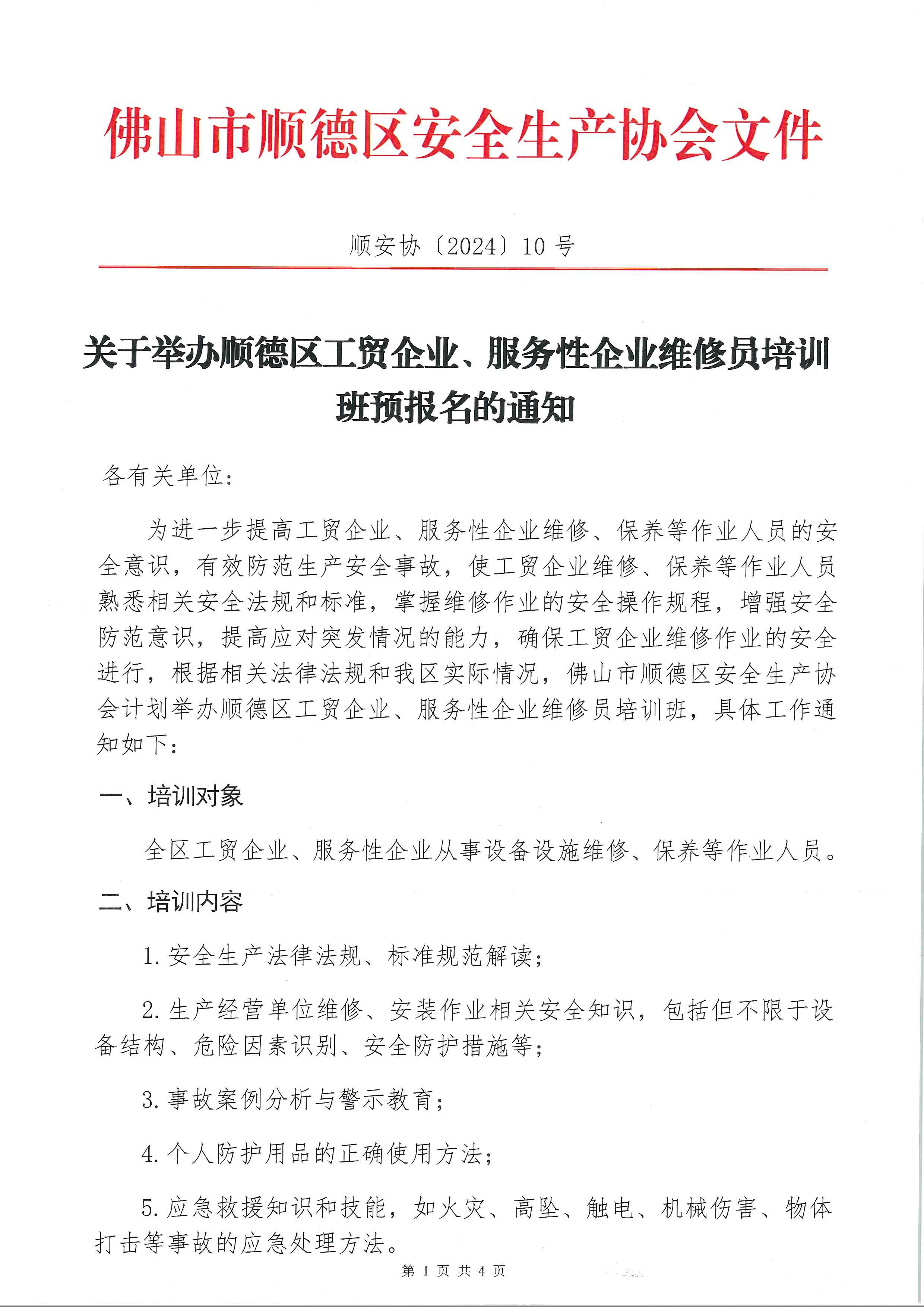 关于举办顺德区工贸企业、服务性企业维修员培训班预报名的通知
