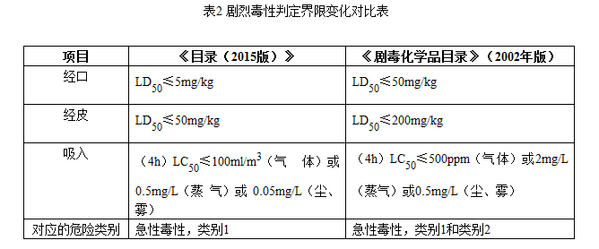 判定界限与《剧毒化学品目录》(2002年版)对比发生了较大变化(见表2)。