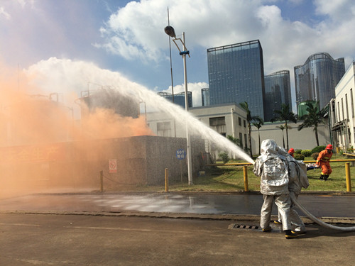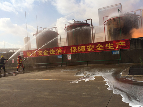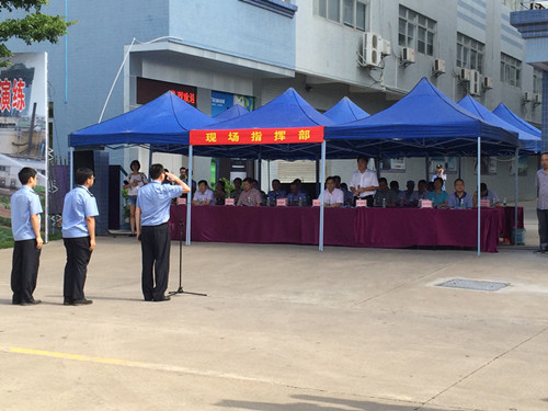 整个演练活动历时约1个小时,9:00分演练正式开始,广东美芝精密制造有限公司动力车间作业人员对一号柴油罐(容量约300立方)进行日常检查时,发现柴油罐有油泄漏,马上组织人员对泄漏的一号柴油罐进行堵漏维修作业,由于作业人员违规作业,电焊渣掉落到一号柴油罐体内起火爆炸,大火随即从柴油罐口向外喷火,伴随着滚滚浓烟,并波及附近气站的CO管道,引发CO气体的泄漏;同时导致生产车间停电;油罐区现场的3名作业人员被大火烧伤在地,CO气体泄漏点附近的3名作业人员中毒晕倒,另有5名路过工人吸入CO气体感到不适。动力车间值班员发现警情,立即逐级向上汇报,公司接报后马上启动事故应急救援预案,同时拨打119,区镇两级接到事故报告后,迅速启动应急预案系统,消防、医疗机构、安监、环保等相关部门赶往事故现场开展救援工作,最终成功完成救援工作,遏制了重特大安全事故的发生。整个演练过程中,各参演单位反应迅速、分工明确、协调有序,圆满完成演练。