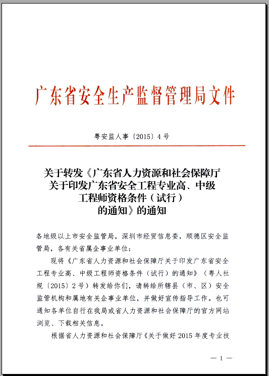 转发《广东省人力资源和社会保障厅关于印发广东省安全工程专业高、中级工程师资格条件的通知》