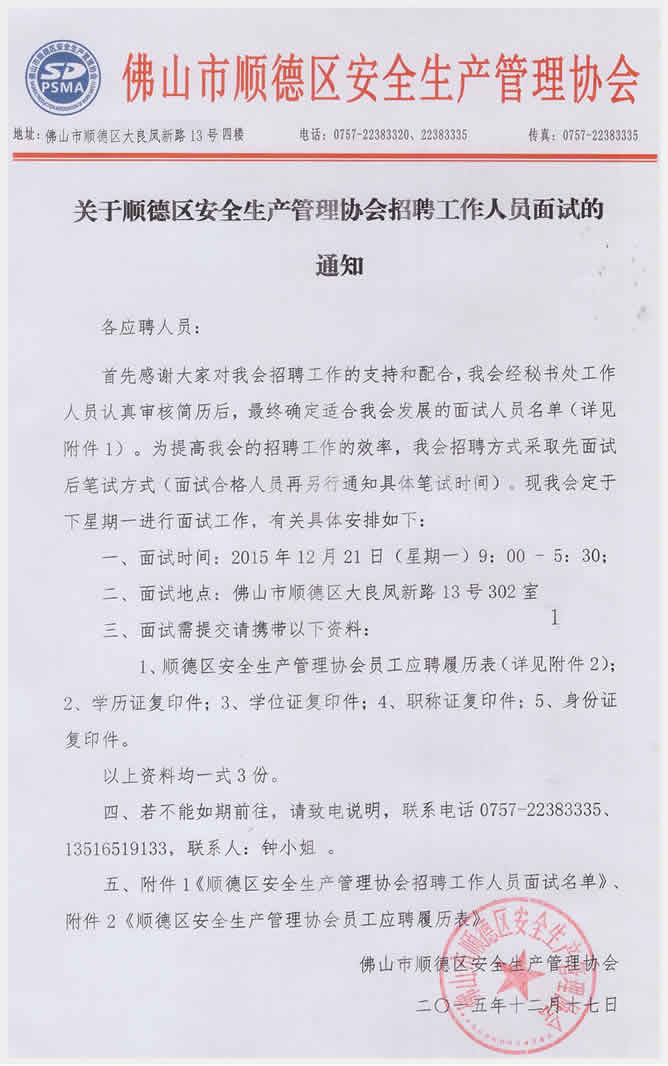 关于顺德区安全生产管理协会招聘工作人员面试的通知