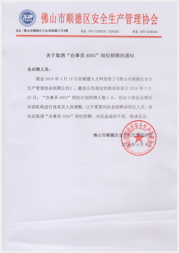 关于顺德区安全生产管理协会取消“办事员A003”岗位招聘的通知