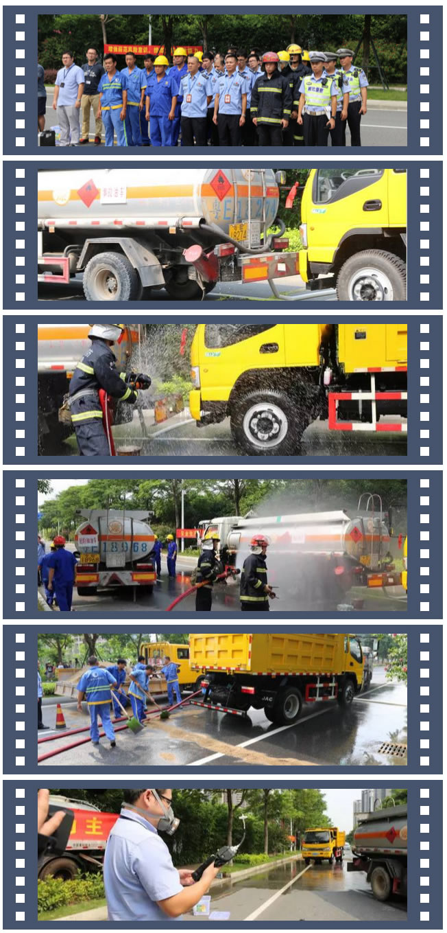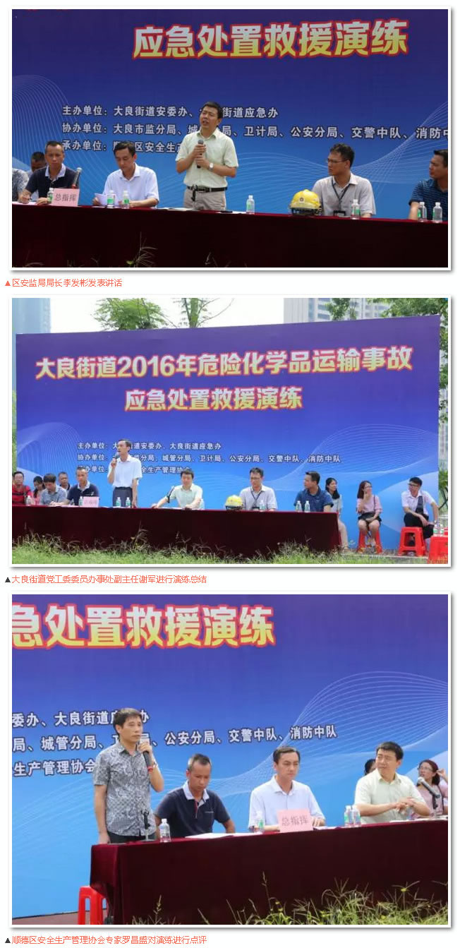 上午9时20分,一辆运载汽油的罐车途径海山北路与一辆同方向行驶的货车发生碰撞事故,致使汽油罐车罐体损坏,汽油泄漏,演练随即展开。随着现场演练总指挥指令的发出,各部门参演人员按照演练部署,对汽油泄漏的发现、上报、泄漏点的处置、应急救援设施设备的应用及抢险人员防护设备的佩戴等进行了有序地演练。通过演练,既提高了各部门对危险化学品运输事故的现场应急处理能力,特别是部门之间的协调能力,同时,进一步提高各部门对该类事故应急处置的反应能力。演习结束后,顺德区安全生产管理协会专家罗昌盛对演练进行了点评,并提出了改进的措施。大良街道党工委委员办事处副主任谢军进行了演练总结,他表示“大良街道是顺德区的中心点,事故的应急演练具有实际的必要性,同时对防止此类事故的次生灾害提供了现场经验”。区安监局局长李发彬充分肯定了此次演练的效果,“今天所流的汗水是为了日后能少流汗水,各相关部门要认真对待事故应急救援演练,不断完善应急救援预案,提高应急处置能力、救援能力,为实现地区得安全生产形势持续稳定作出贡献”。