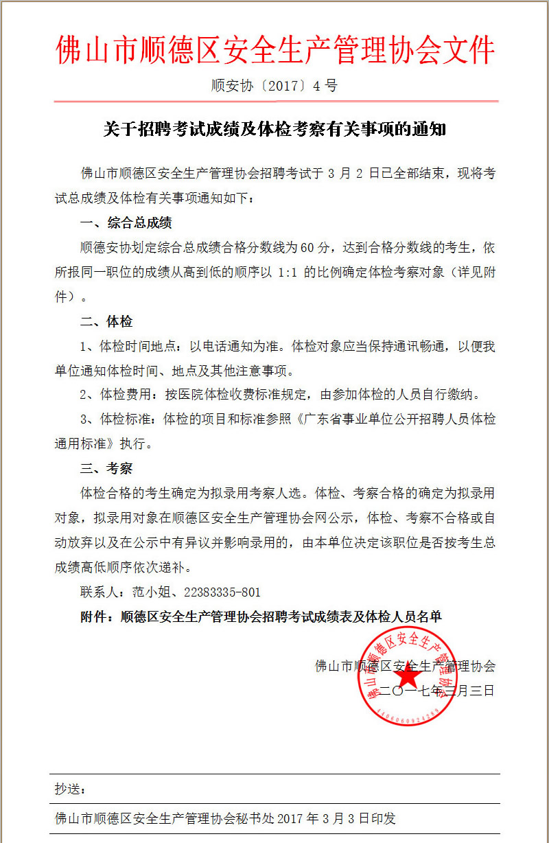 顺德区安全生产管理协会招聘考试成绩表及体检人员名单