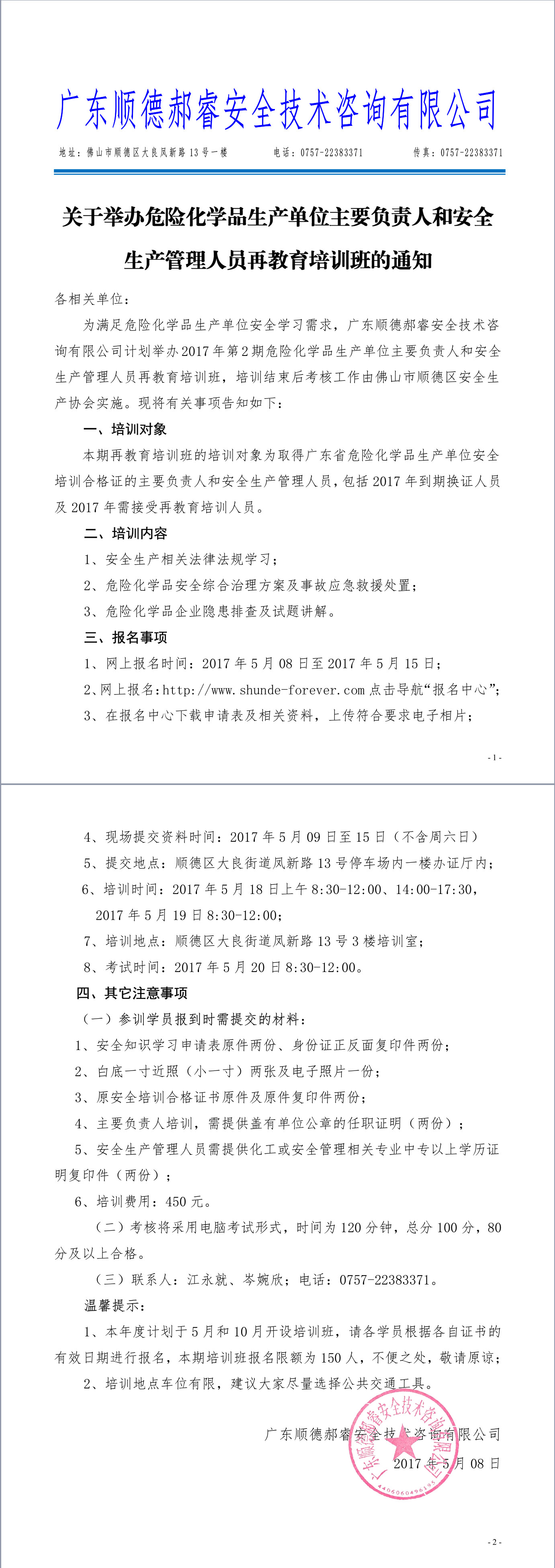 为满足危险化学品生产单位安全学习需求,广东顺德郝睿安全技术咨询有限公司计划举办2017年第2期危险化学品生产单位主要负责人和安全生产管理人员再教育培训班,培训结束后考核工作由佛山市顺德区安全生产协会实施。现将有关事项告知如下: