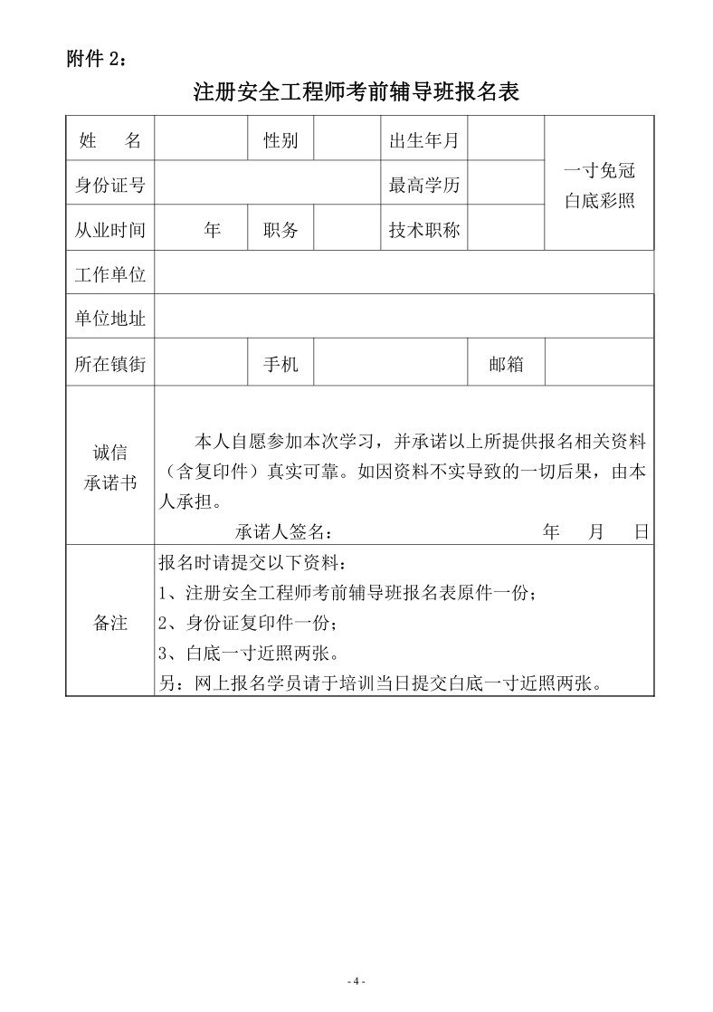 附件2:注册安全工程师考前辅导班报名表