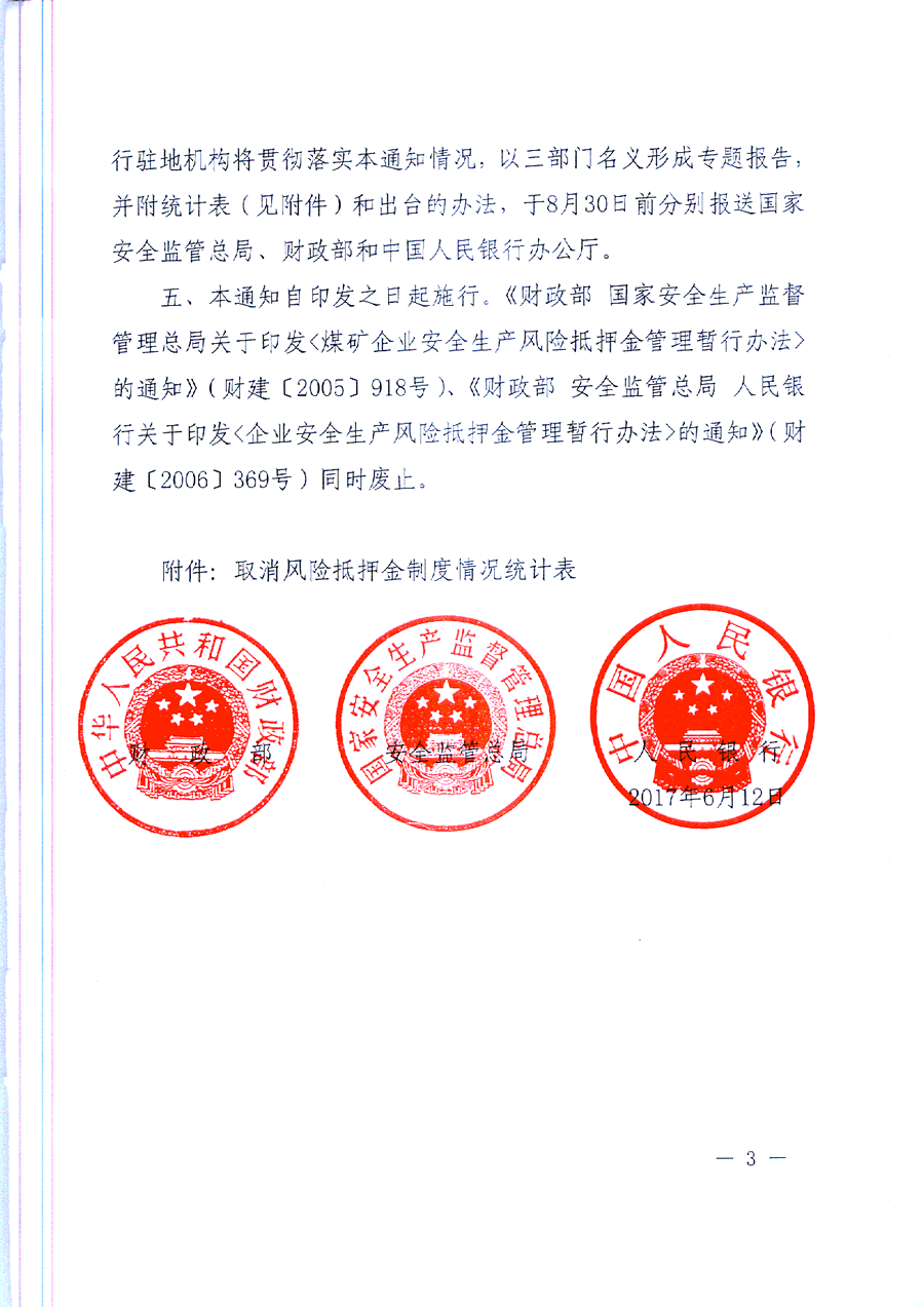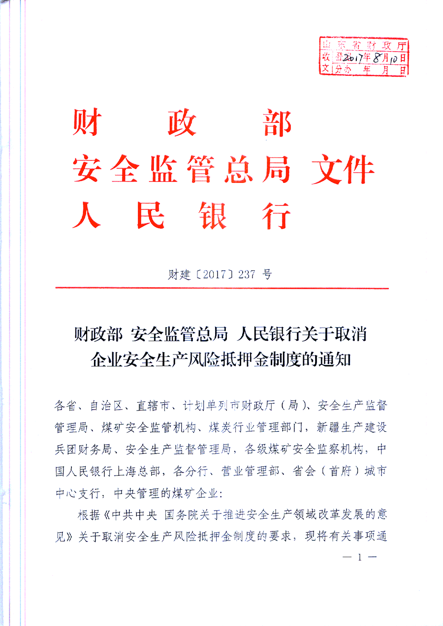 财政部、安监总局、人民银行关于取消企业安全生产风险抵押金制度的通知(财建〔2017〕237号)