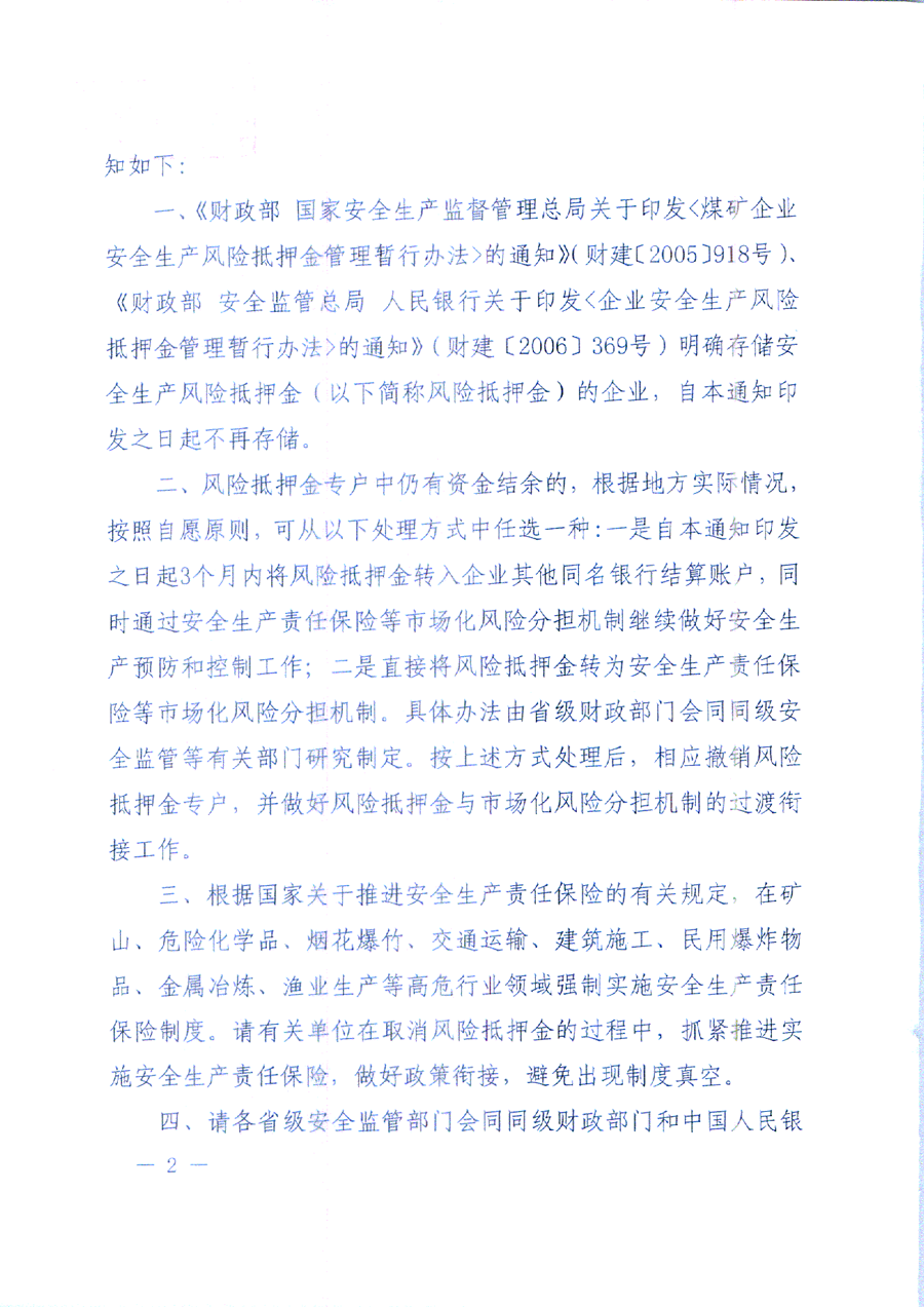 财政部、安监总局、人民银行关于取消企业安全生产风险抵押金制度的通知