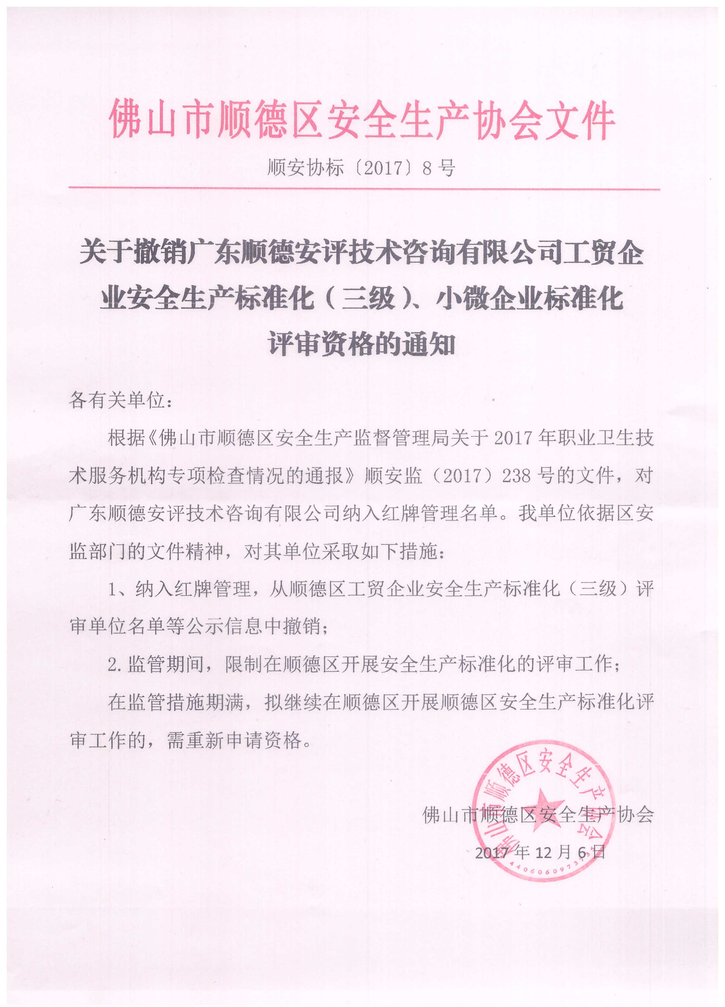 关于撤销广东顺德安评技术咨询有限公司工贸企业安全生产标准化(三级)、小微企业标准化评审资格的通知