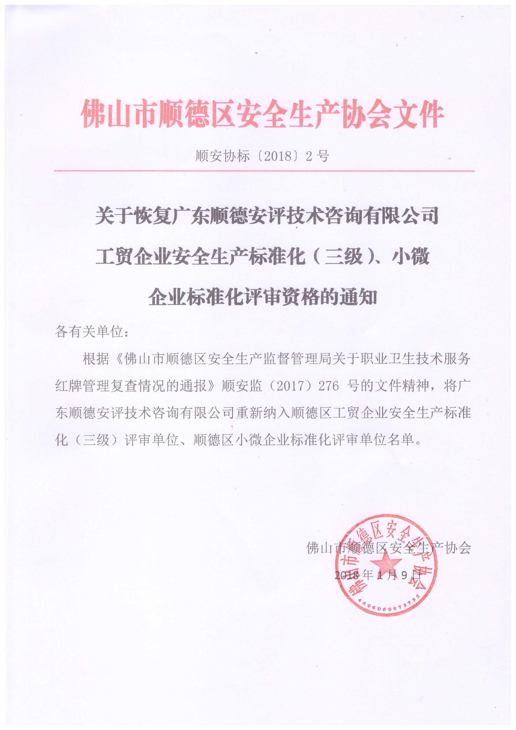 关于恢复广东顺德安评技术咨询有限公司工贸企业安全生产标准化(三级)、小微企业标准化评审资格的通知