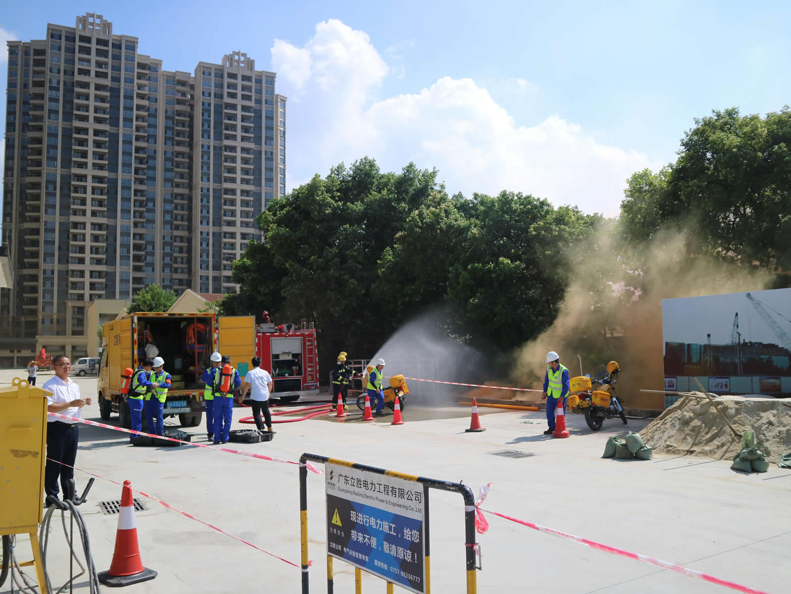 此次演练模拟地铁三号线A站基坑25轴第二层开挖地连墙接缝处出现突水涌砂险情,并发生坍塌和3名施工人员被困事故,事故还导致20米范围内的一栋28层居民楼受损倾斜度万分之五和居民楼内2名居民被困电梯、燃气管道撕裂泄漏等次生灾害。区安委会接报后立即启动《顺德区生产安全事故应急预案》,成立现场指挥部,区消防、公安、安监、市监、卫计等部门应急救援力量迅速赶赴现场开展救援。