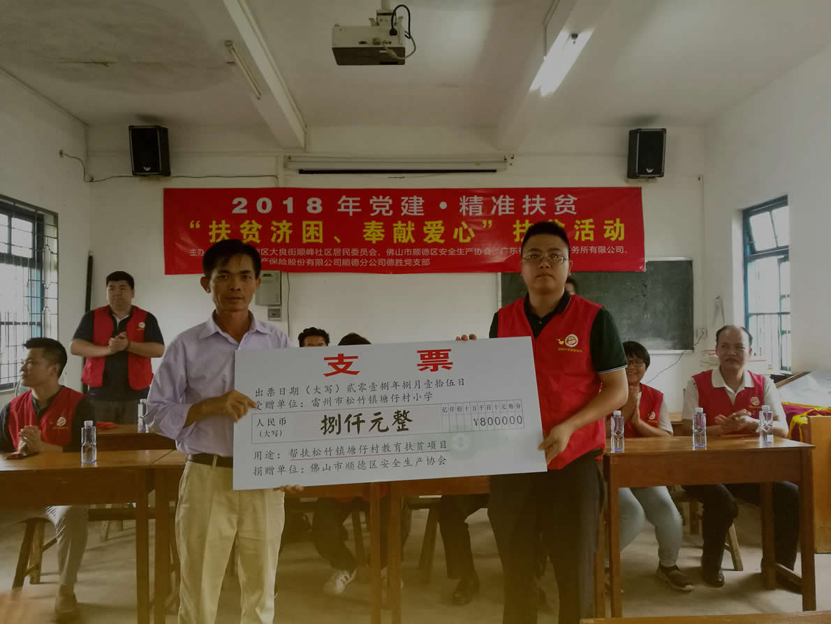 (图为雷州塘仔村小学校长接受区安协的捐赠支票)
