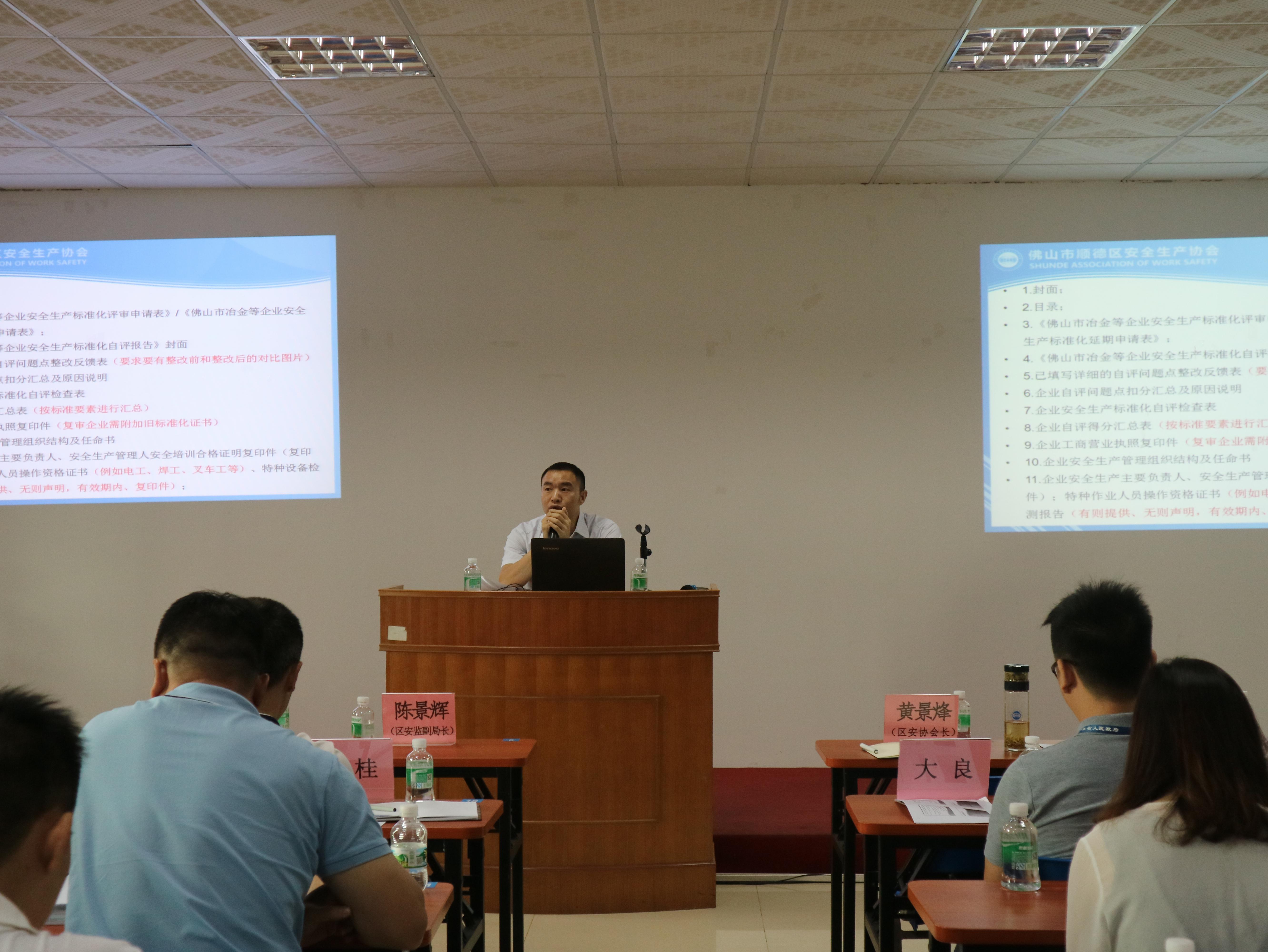 为贯彻落实《佛山市顺德区安全生产监督管理局关于加快推进冶金等行业企业安全生产标准化创建工作的通知》(顺安监﹝2018﹞212号)的要求, 加快实现全区冶金等企业安全生产标准化达标全覆盖的任务目标,总结标准化上一阶段工作完成情况,明确下一阶段工作要求。10月9日上午,顺德区安全生产协会组织召开顺德区冶金等行业安全生产标准化(三级)工作会议,区安监局副局长陈景辉、一科科长谢峰、各镇(街)分局代表、协会长黄景烽、秘书长潘友强、副秘书长邓昕、各评审单位和帮扶服务机构代表出席参加了本次会议。