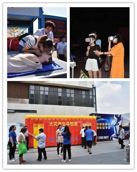 礼堂内高亢激扬,礼堂外设有协会的安全宣传车,通过观看安全宣传视频、心肺复苏实操体验、应急情景VR体验、火灾逃生体验屋等活动,为广大师生和市民奉上一堂全面、精彩、生动的安全生产宣传咨询教育课。