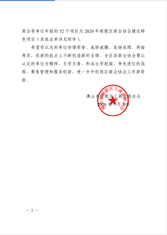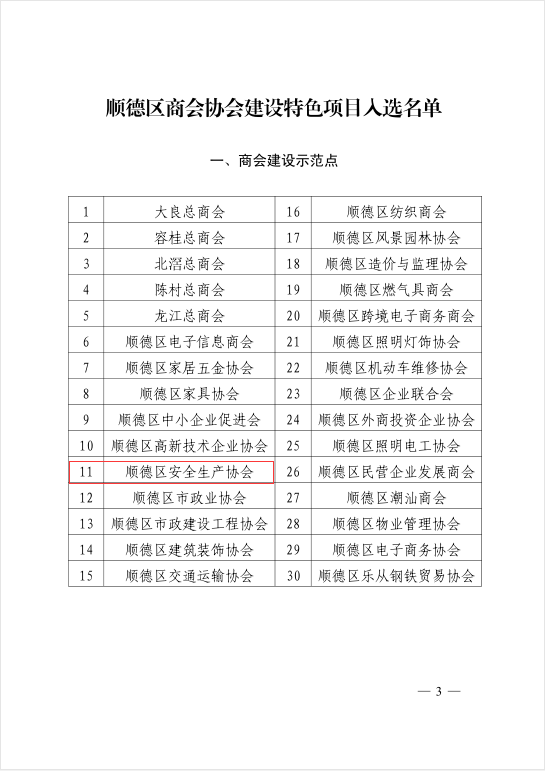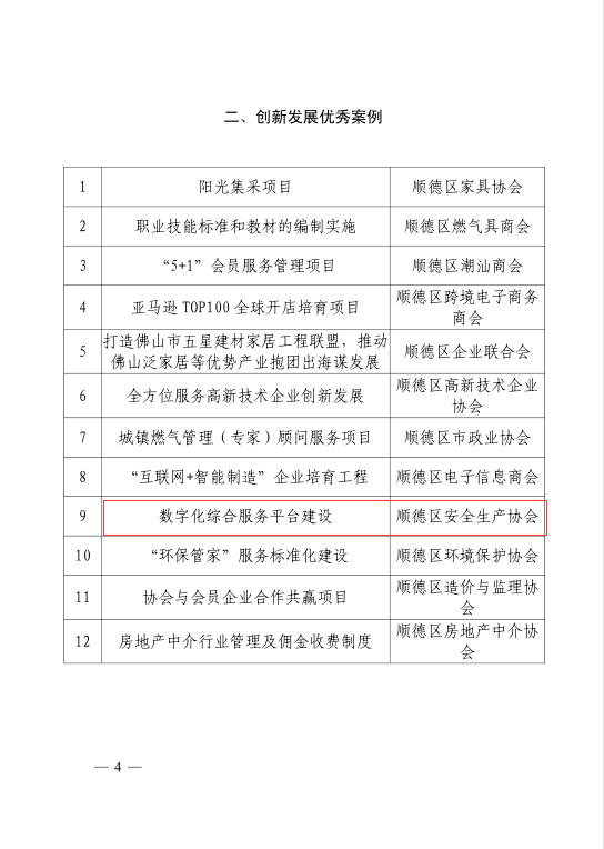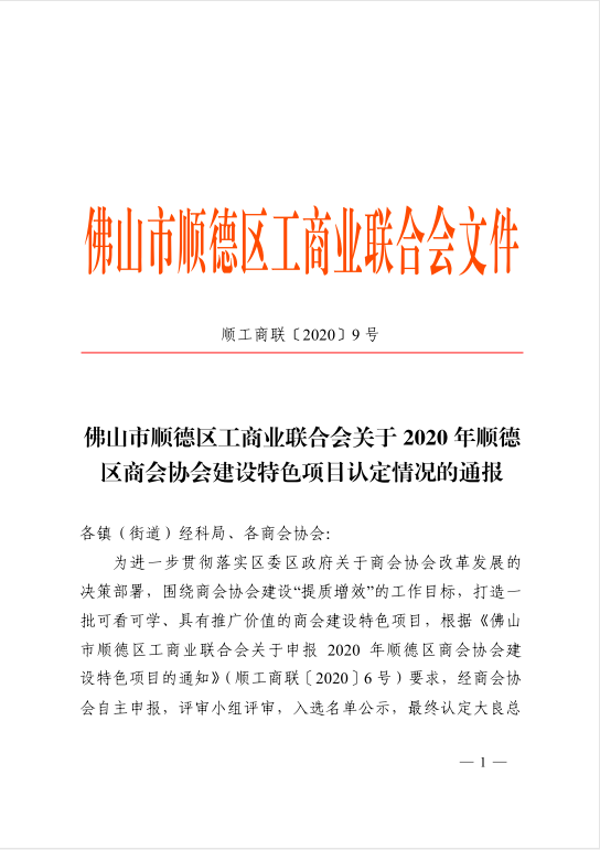 近日,顺德区工商业联合会通报了2020年顺德区商会协会建设特色项目认定情况,顺德区安全生产协会入选在列,获评为“商会建设示范点”与“创新发展优秀案例”。