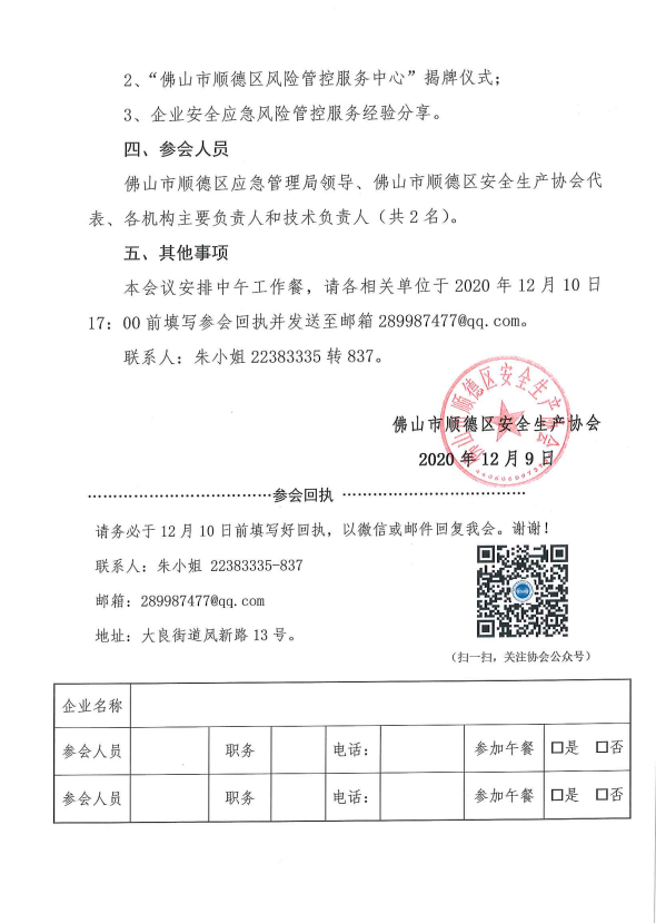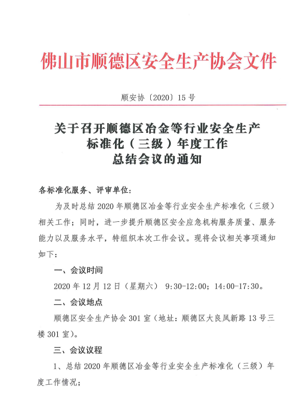 顺安协[2020]15号关于召开顺德区冶金等行业安全生产标准化(三级)年度工作总结会议的通知