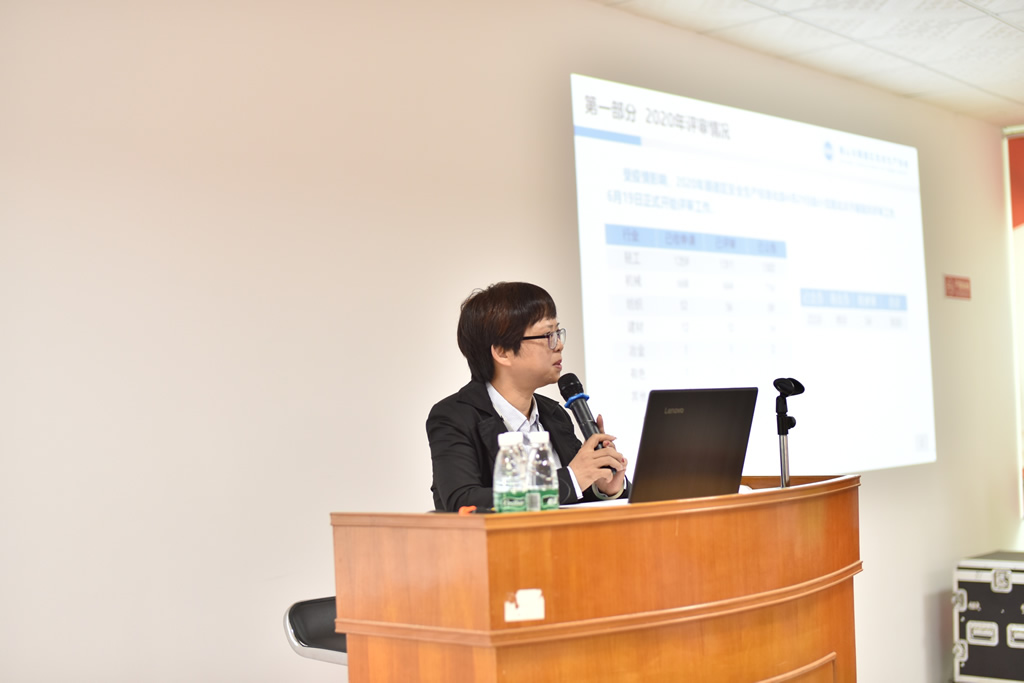 顺德区安全生产协会邓昕副秘书长代表作2020年顺德区冶金等行业安全生产标准化(三级)年度工作总结报告,汇报了2020年在疫情影响下的评审情况,分析了本年度评审中帮扶机构的常见问题,分享了由协会牵头编制的《广东省企业安全生产标准化创建指导单位工作规范》情况。