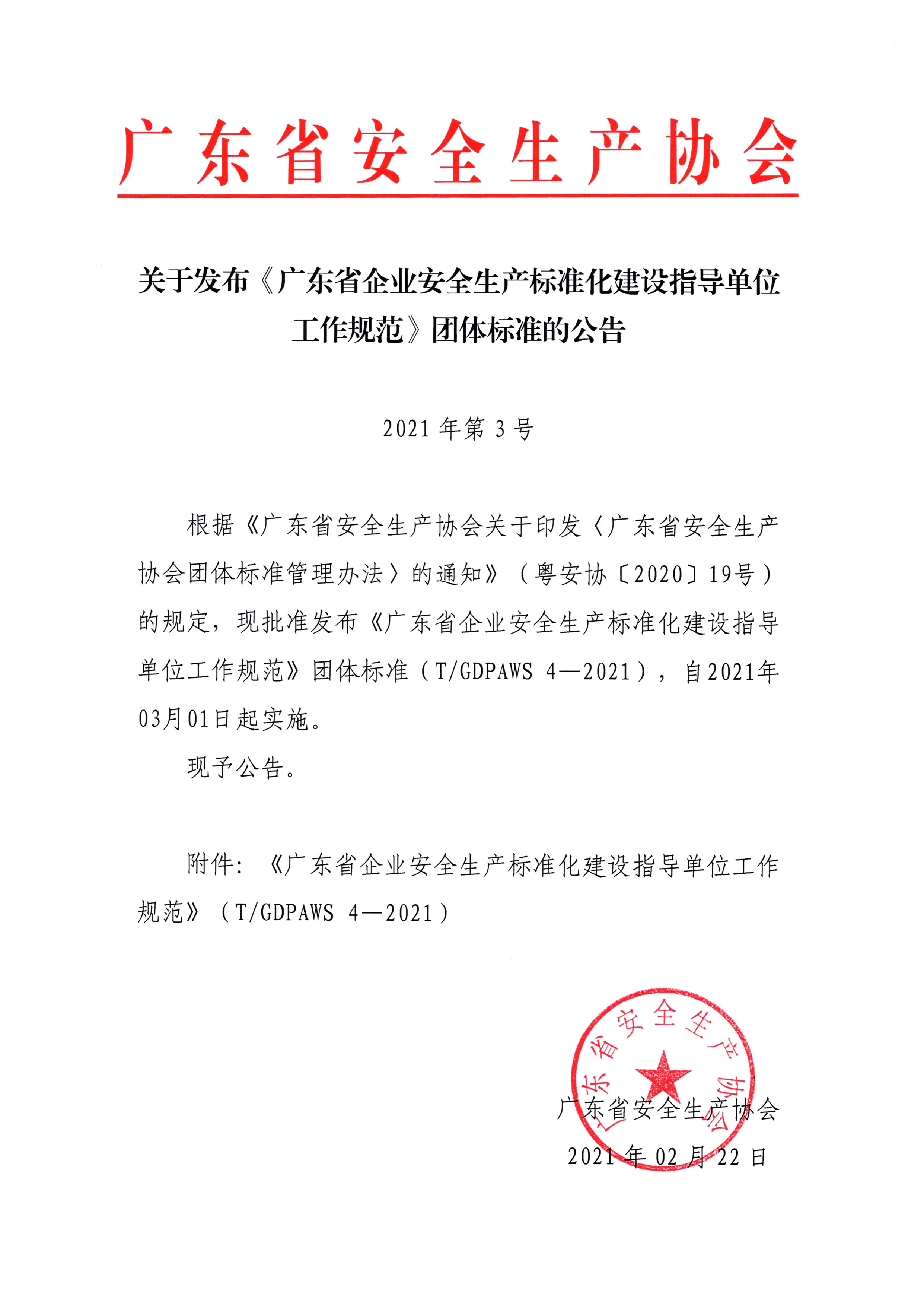 关于发布《广东省企业安全生产标准化建设指导单位工作规范》团体标准的公告