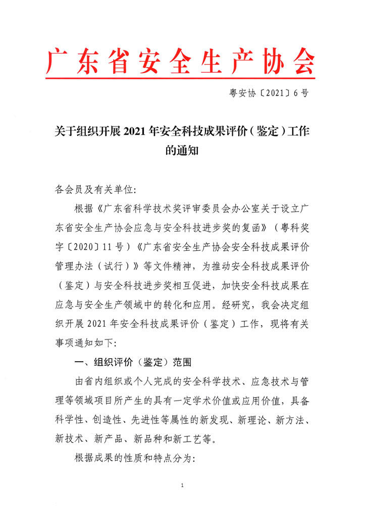 粤安协[2021]6号关于组织开展2021年安全科技成果评价(鉴定)工作的通知