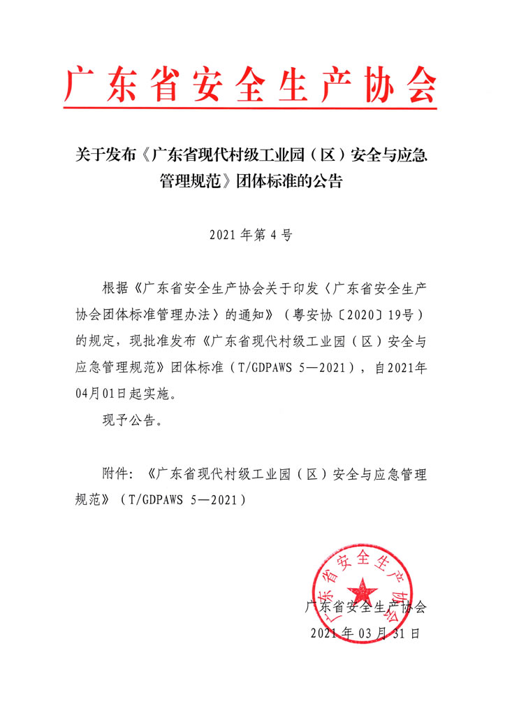关于发布《广东省现代村级工业园(区)安全与应急管理规范》团体标准的公告
