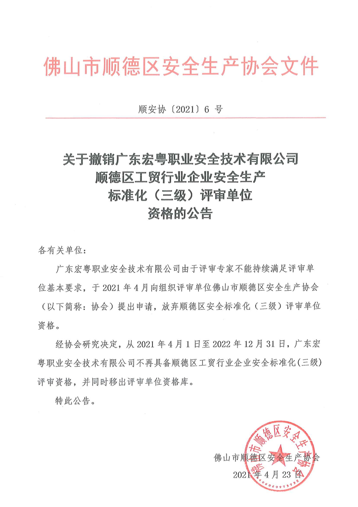 顺安协[2021]6号关于撤销广东宏粤职业安全技术有限公司顺德区工贸行业企业安全生产标准化(三级)评审单位资格的公告